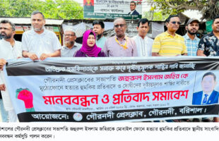 প্রেসক্লাব সভাপতি জহিরকে হত্যার হুমকির প্রতিবাদে গৌরনদীতে মানববন্ধন ও প্রতিবাদ সমাবেশ