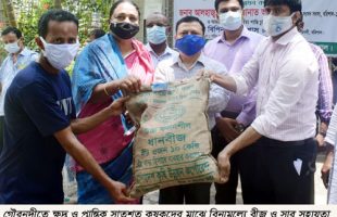 শেষে প্রতি কৃষকের মাঝে পাঁচ কেজি আমনের বীজ ও ২০ কেজি সার বিতরণ করেন অতিথিরা।